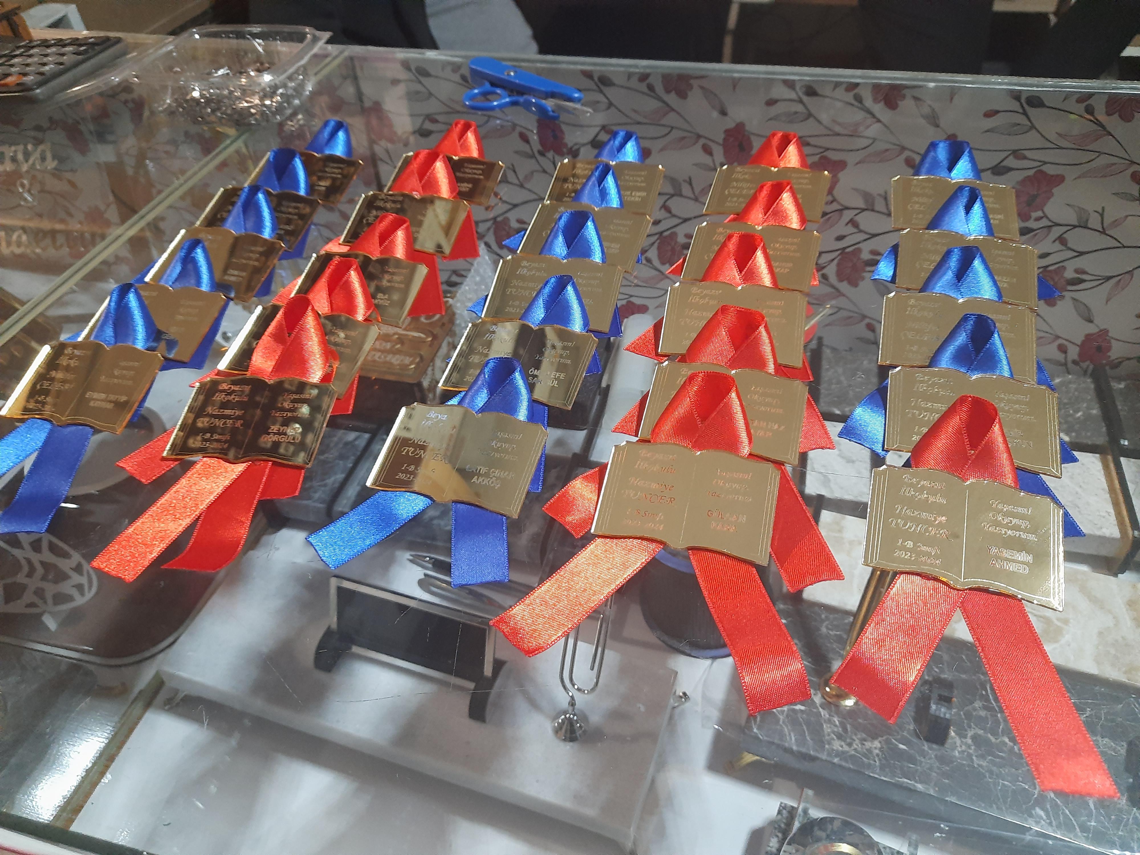 Kitap Broş gold pleksi altına kırmızı mavi kurdeladır.