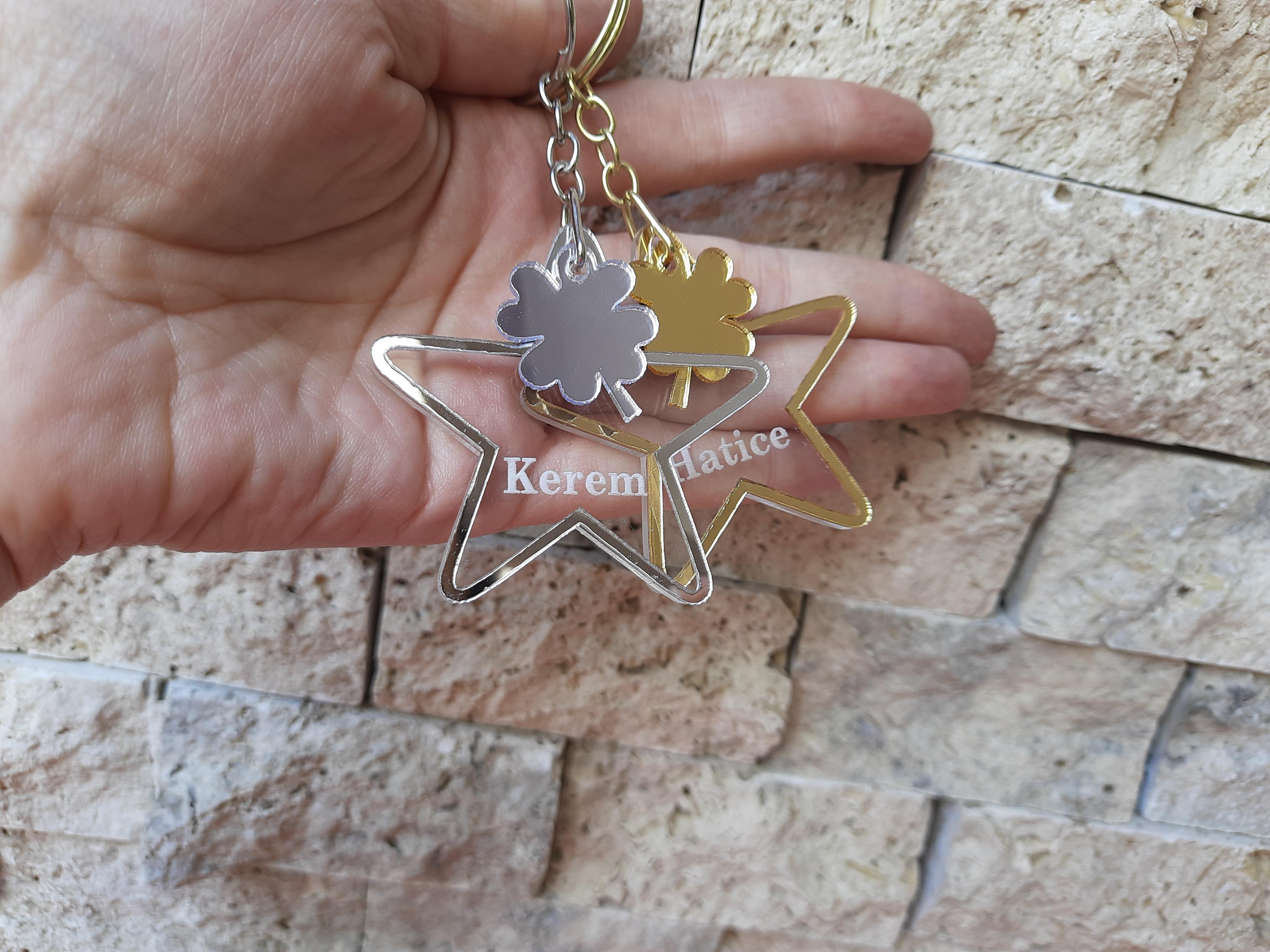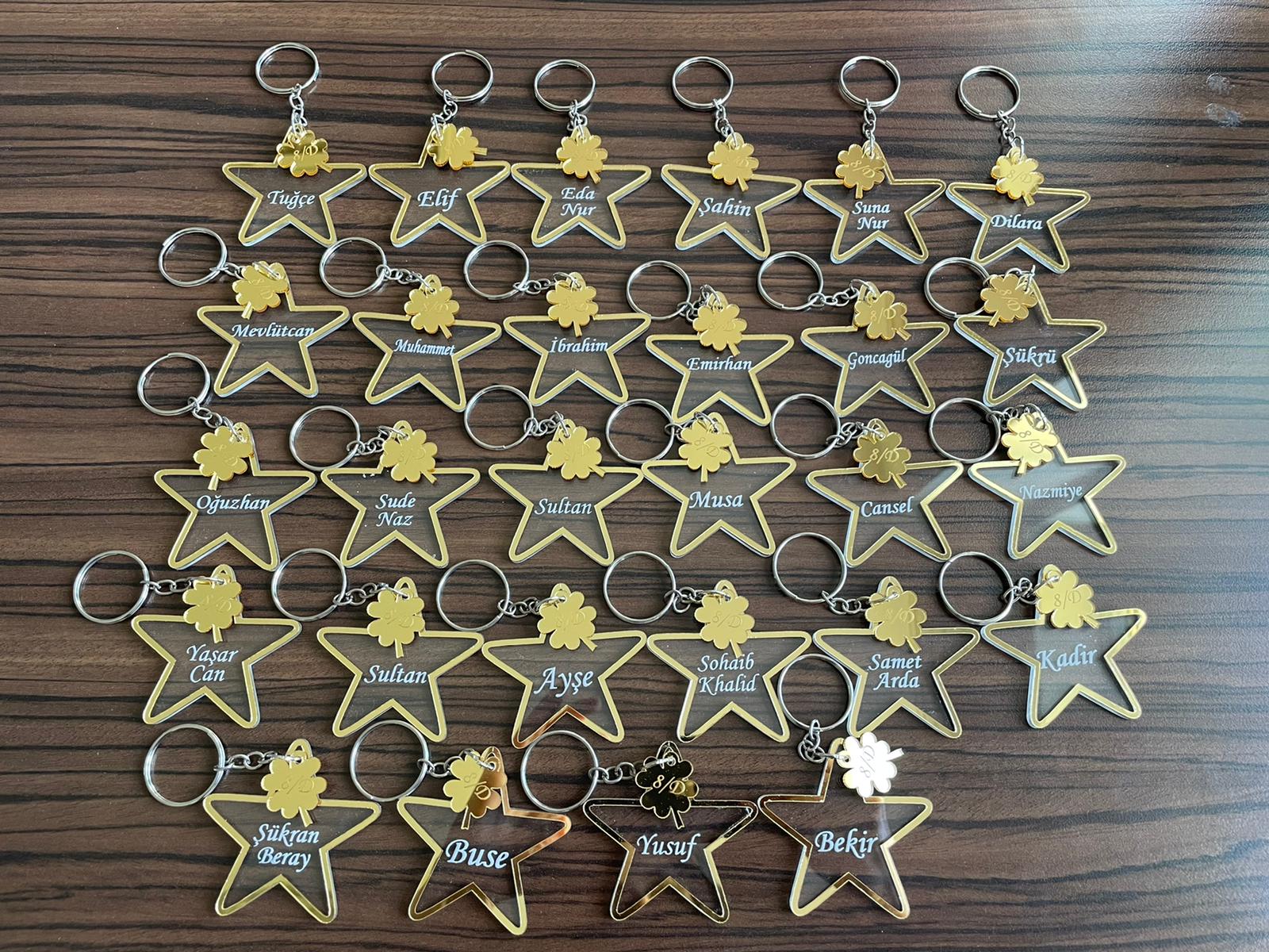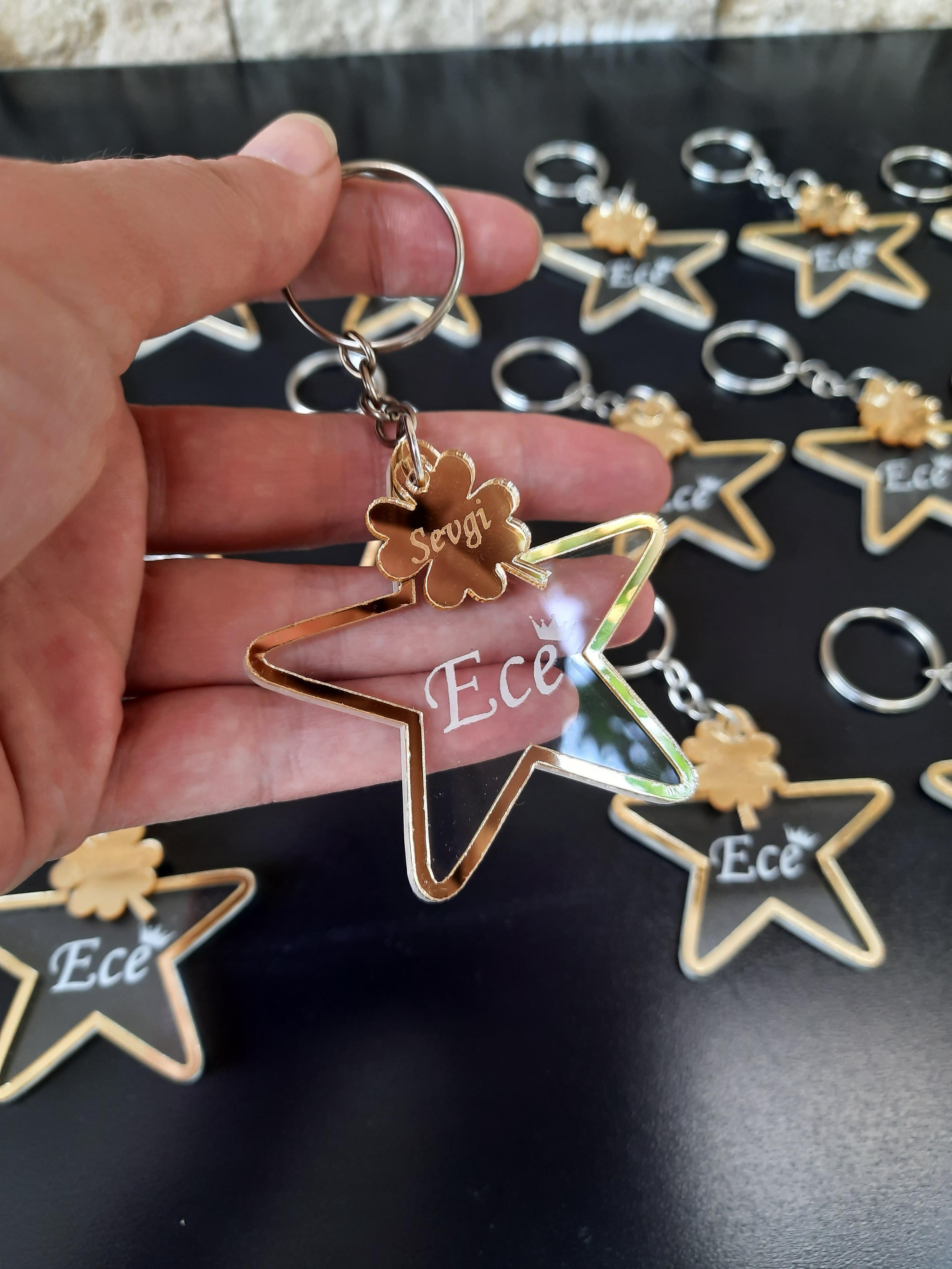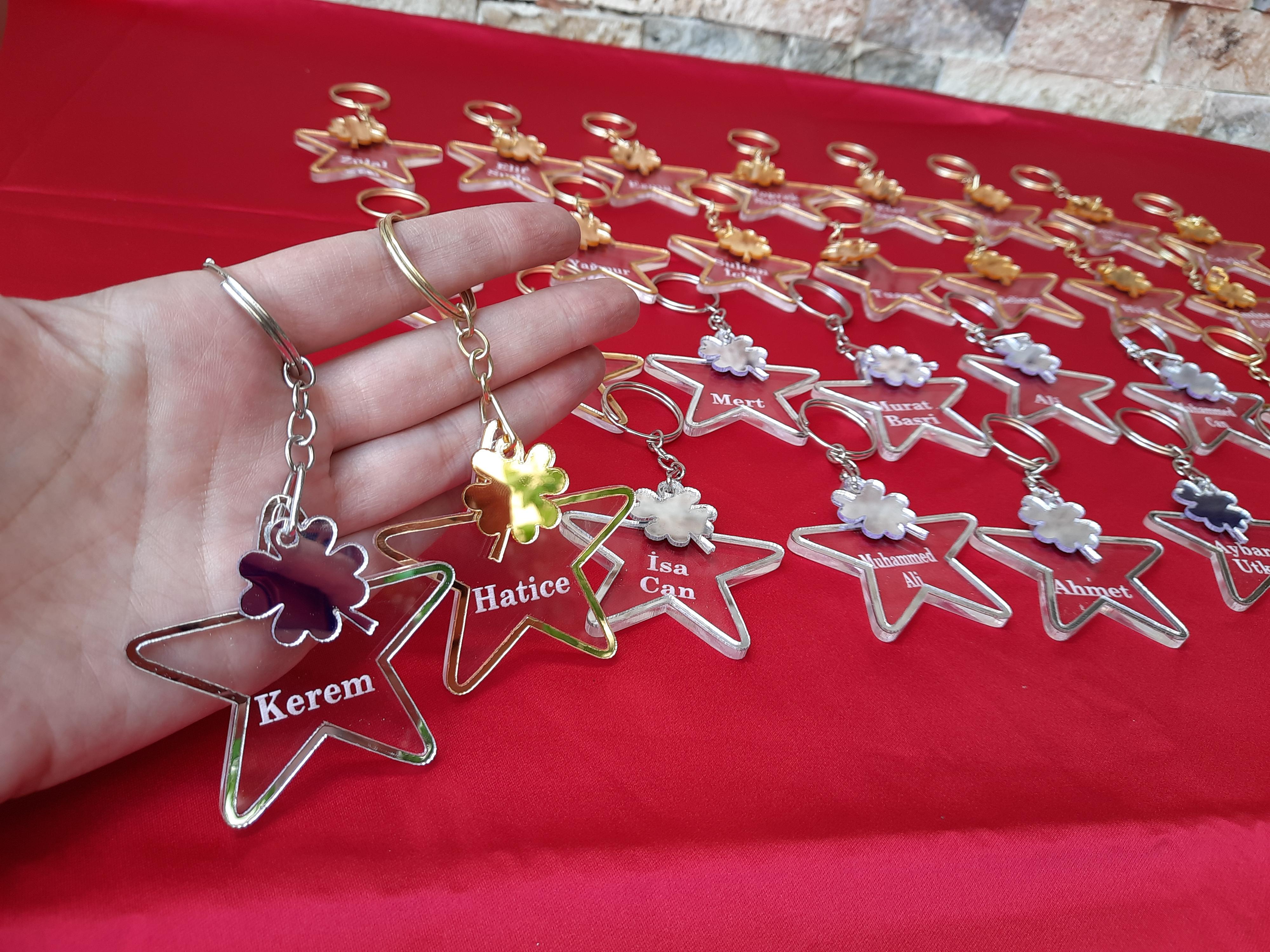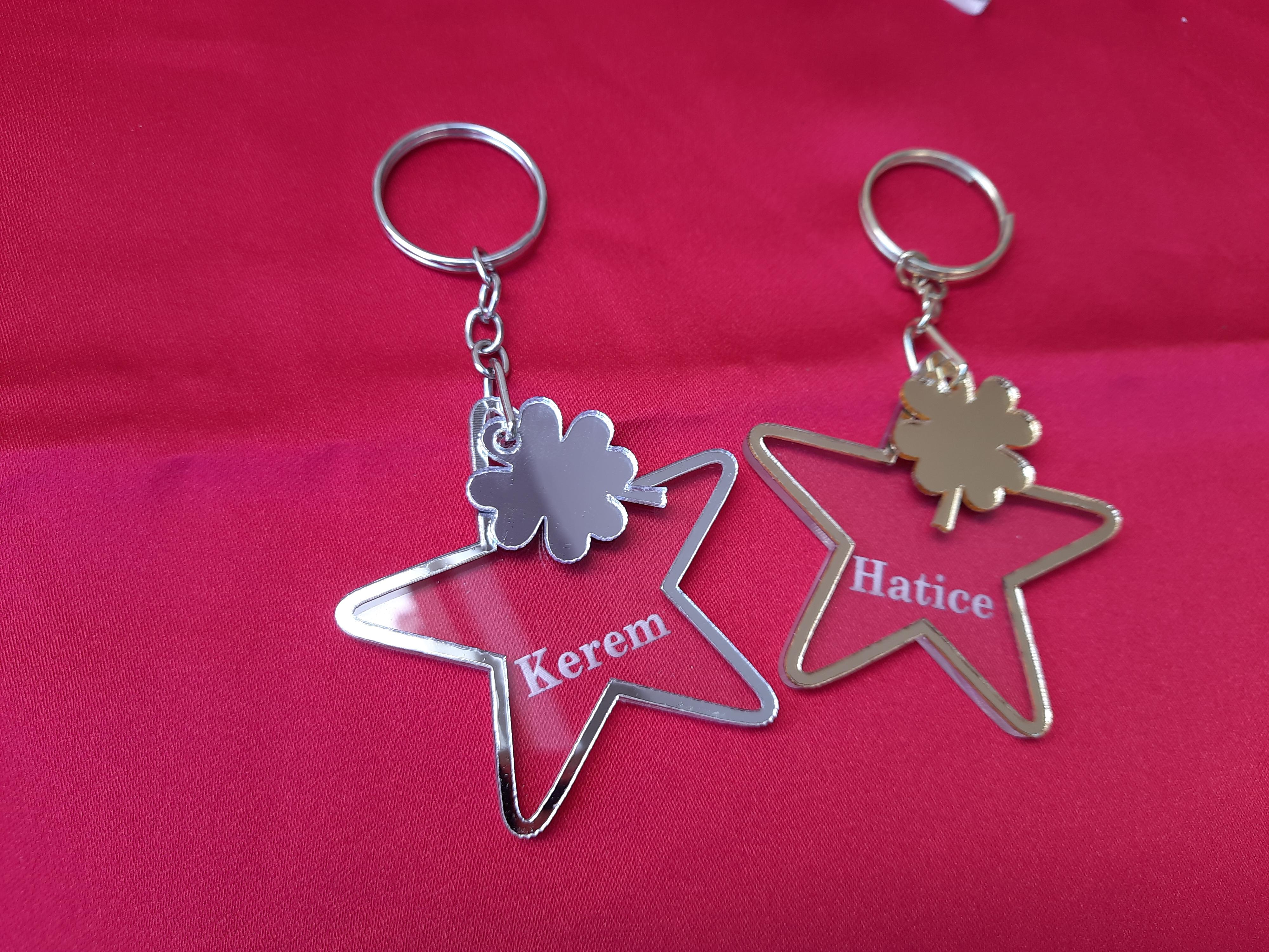Yıldız Anahtarlık modelimiz 6 cm ölçülerindedir. Ürün malzemesi 1mm pleksi altına 3 mm şeffaf pleksidir.